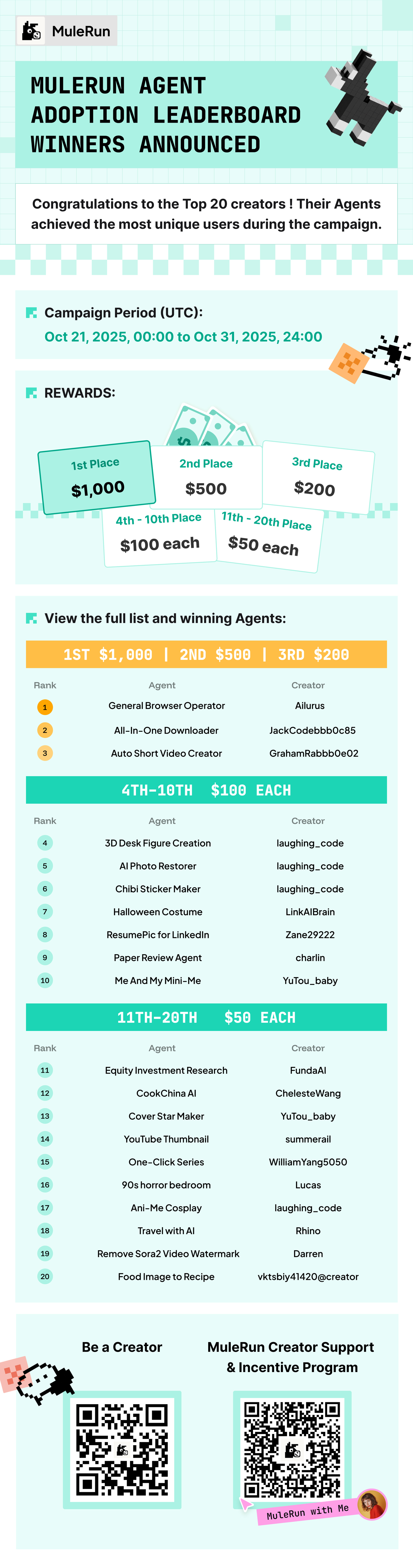 Congratulations to the 20 Creators who made the Top 20 Agent Adoption Leaderboard and earned bonuses!