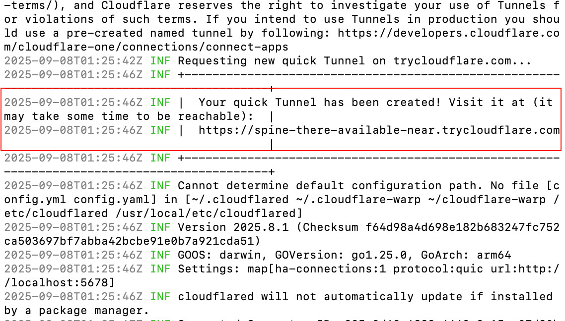 This indicates that a temporary tunnel has been successfully created, and Cloudflare provides a public domain name.