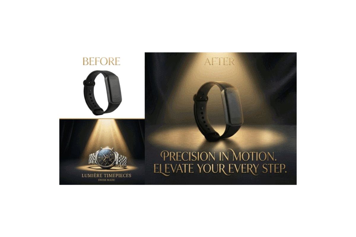 | Product photo + Reference ad | Mood, colors, composition, lighting, typography style | Original marketing image + Artistic slogan |